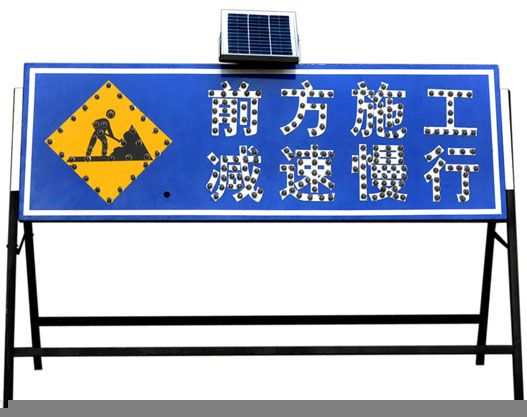 太阳能交通标志是交通标志牌的一种,由标志面、标志底板、太阳能电池板、控制器、发光单元(LED)组成,用文字与图案传递警告、禁令、指示信息给司机和行人,用以管理道路交通的安全设施。白天太阳能电池板吸收太阳光,把太阳能转化成电能,储存在储能器件中,到了晚上,储能器件中的电能自动转化成光能(通过光电开关控制),通过LED发出亮光来勾画图案轮廓,传达交通信息。它给道路使用者以确切的道路交通信息,使道路安全畅通,事关司机和行人的生命财产安全,是一种不可缺少的交通安全附属设施。